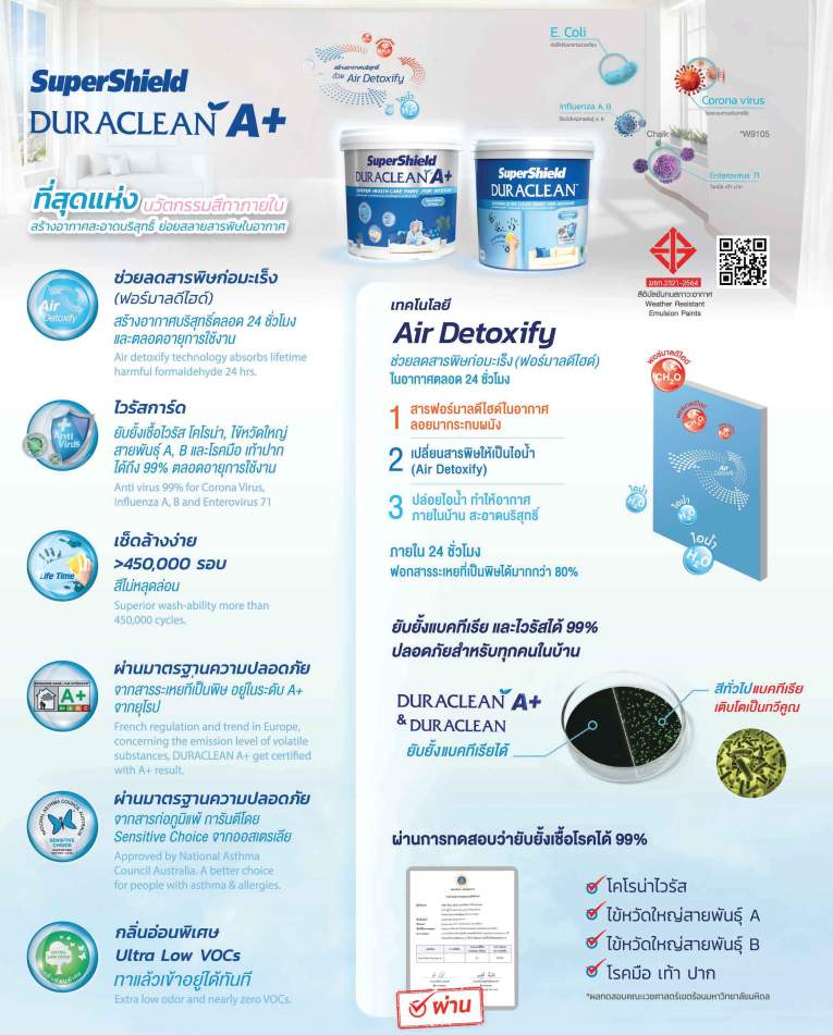 Advance technology, the best interior paint from TOA. 100% high performance pure acrylic waterborne. Air detoxify technology absorbs harmful formaldehyde duration washable and anti-bacterial for lifetime.