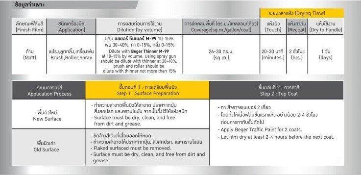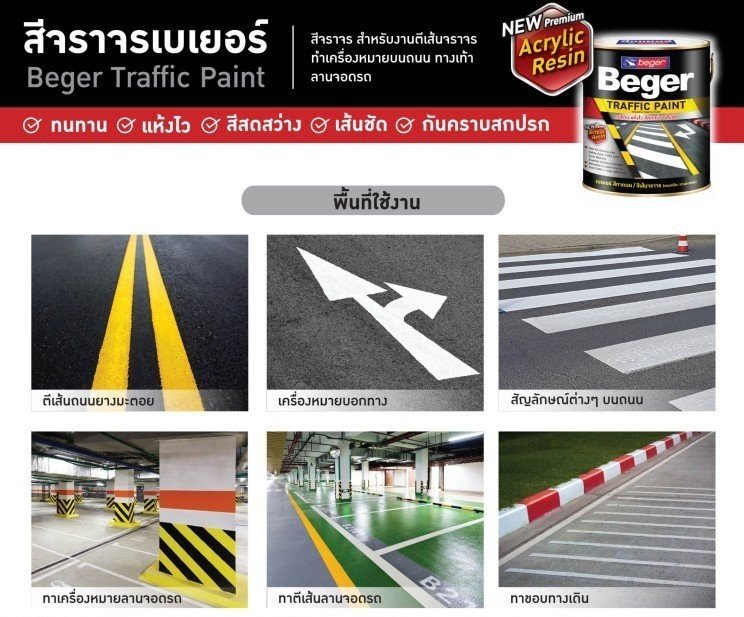 สีทาถนนและเครื่องหมายจราจร เฉดสีใหม่ ฟ้า ชมพู เขียว สำหรับทาบนพื้นถนน มีทั้งชนิดสะท้อนแสงและไม่สะท้อนแสง ผลิตจากอะคริลิกสูตรพิเศษ ให้คุณสมบัติแห้งเร็ว ให้การยึดเกาะพื้นผิวดีเยี่ยม ไม่ลอกล่อน ฟิล์มทนต่อรอยขีดข่วนได้ดีเยี่ยม ทนทานต่อสภาวะอากาศและน้ำ มอบความสวยทนทานระดับ Heavy Duty Coating สมบูรณ์แบบทุกสภาวะ สำหรับตีเส้นจราจรและสัญลักษณ์ต่าง ๆ บนขอบถนน ฟุตบาท พื้นถนน และลานจอดรถ