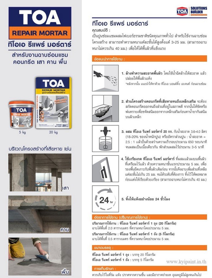 TOA Repair Mortar is a general-grade fiber-reinforced repair mortar designed for structural repair applications. It can be applied in thicknesses ranging from 3 to 40 mm per layer to achieve a strong and durable surface with high load-bearing capacity. The product provides excellent adhesion to existing substrates, is non-shrink, and is suitable for both horizontal and overhead repair works.