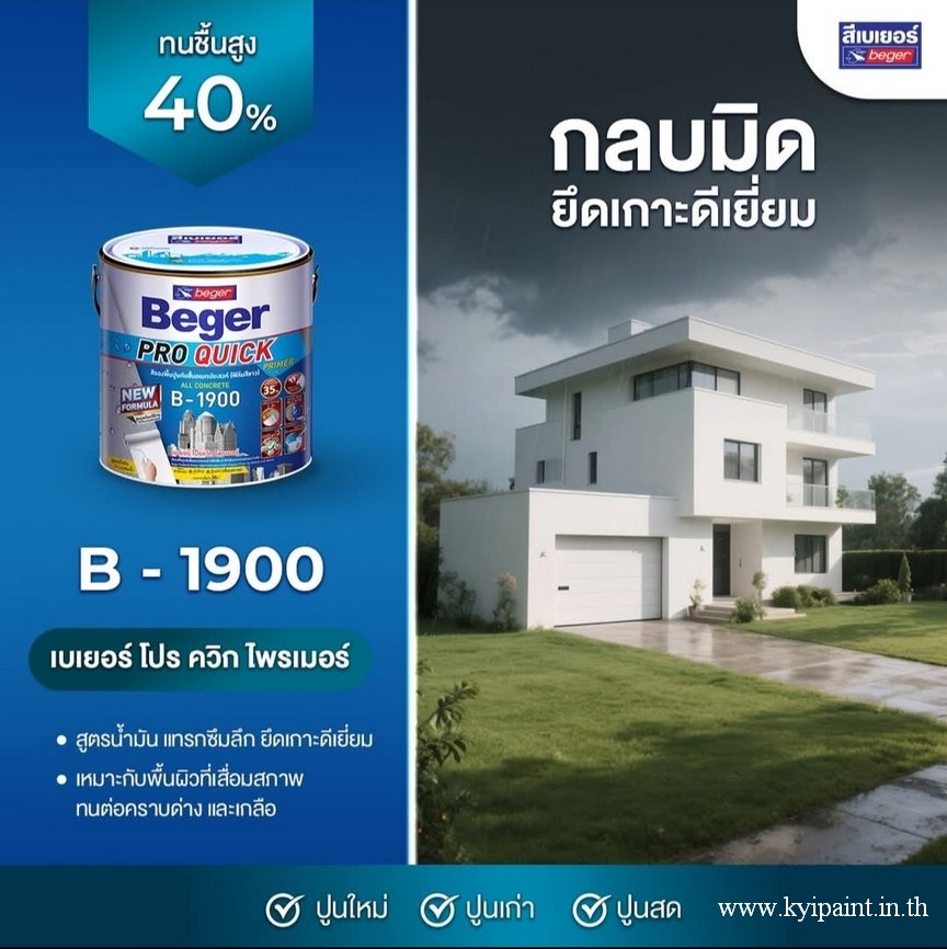 สูตรใหม่! เนื้อสีขาวเข้มข้นกลบพื้นผิวได้ดียิ่งขึ้น พร้อมใช้งานไม่ต้องผสมทินเนอร์! เบเยอร์ บี-1900 สีรองพื้นปูนอเนกประสงค์ สูตรน้ำมัน สามารถทนความชื้นได้สูงสุดถึง 40% ด้วยโมเลกุลขนาดเล็กที่สุดเพียง 0.01 ไมครอน ทำให้เนื้อสีสามารถแทรกซึมและเข้ายึดเกาะกับพื้นผิวได้ลึกและแน่นกว่าสีรองพื้นทั่วไป เหมาะสำหรับงานปูนเก่า ปูนใหม่ และปูนสด (ปูนที่เพิ่งฉาบเสร็จ 2 วันเป็นต้นไป)