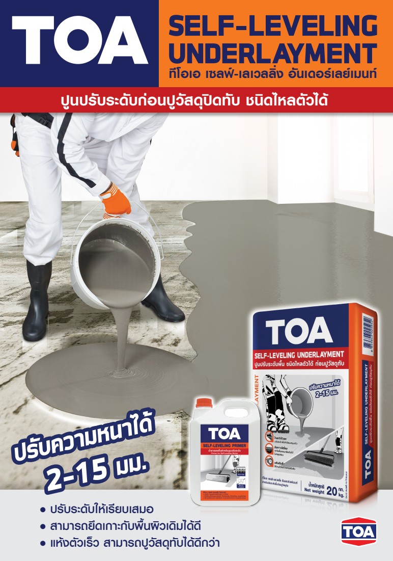ทีโอเอ เซลฟ์ เลเวลลิ่ง อันเดอร์เลย์เมนท์ ผลิตภัณฑ์มอร์ตาร์สำเร็จรูปสำหรับปรับระดับพื้นชนิดไหลตัวได้เองโดยไม่ต้องใช้เกรียงปาดช่วย ทำความหนา 2-15 มิลลิเมตร ใช้เตรียมพื้นผิวคอนกรีตหรือซีเมนต์ให้เรียบและได้ระดับก่อนการปูวัสดุปิดทับ พื้นผิวที่ได้จะมีความเรียบเนียน
